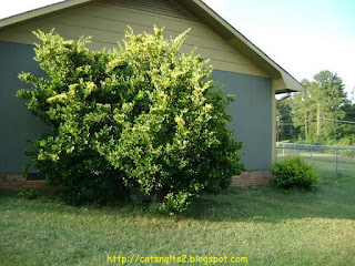 There were two huge "not a foundation" shrubs flanked by two "growing far too big" needle point holly bushes. I don't what the heck those things were/are but we have more on the side of the house. I took a picture of those so you can see what happens when they are unattended. In the picture above, you can see part of the latest holly bush that he severely cut back on the left. There WAS another just as bad down there by the down spout at the end of the patio. Three more holly bushes remain and really the largest one on the end of the house is indicative of just how badly overgrown they can get.