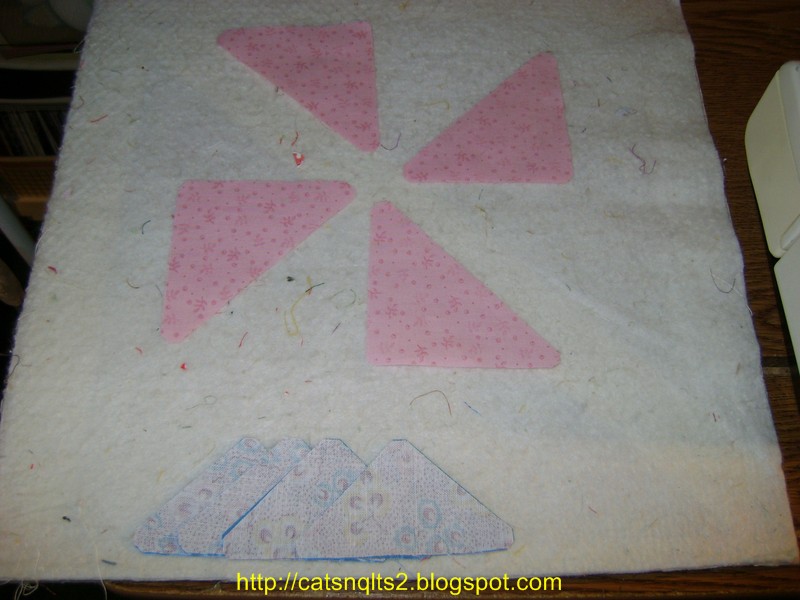 Also do yourself a favor and make yourself a little design board. This is a tip I got from my pal and quilt mentor Joy who had a lot of other good ideas that I follow to this day. It is just a piece of cardboard cut big enough to put in the bottom of a pizza box and covered with some quilt batting. (Actually I have two of them---one with a black felt background but this one was closest.) The batting holds the pieces in place unless a nosy kitty comes along and it is portable. When it is time to play with the blocks you'll probably need the design wall space but for one block, this works fine.